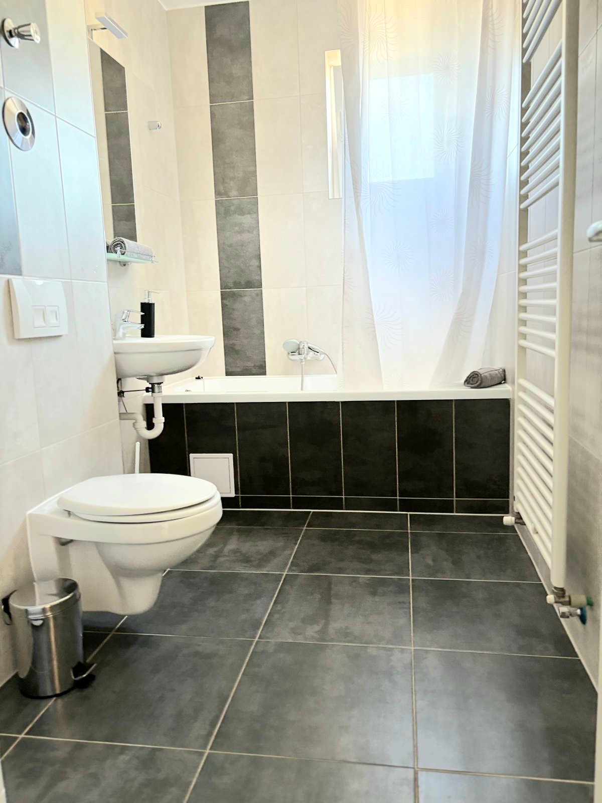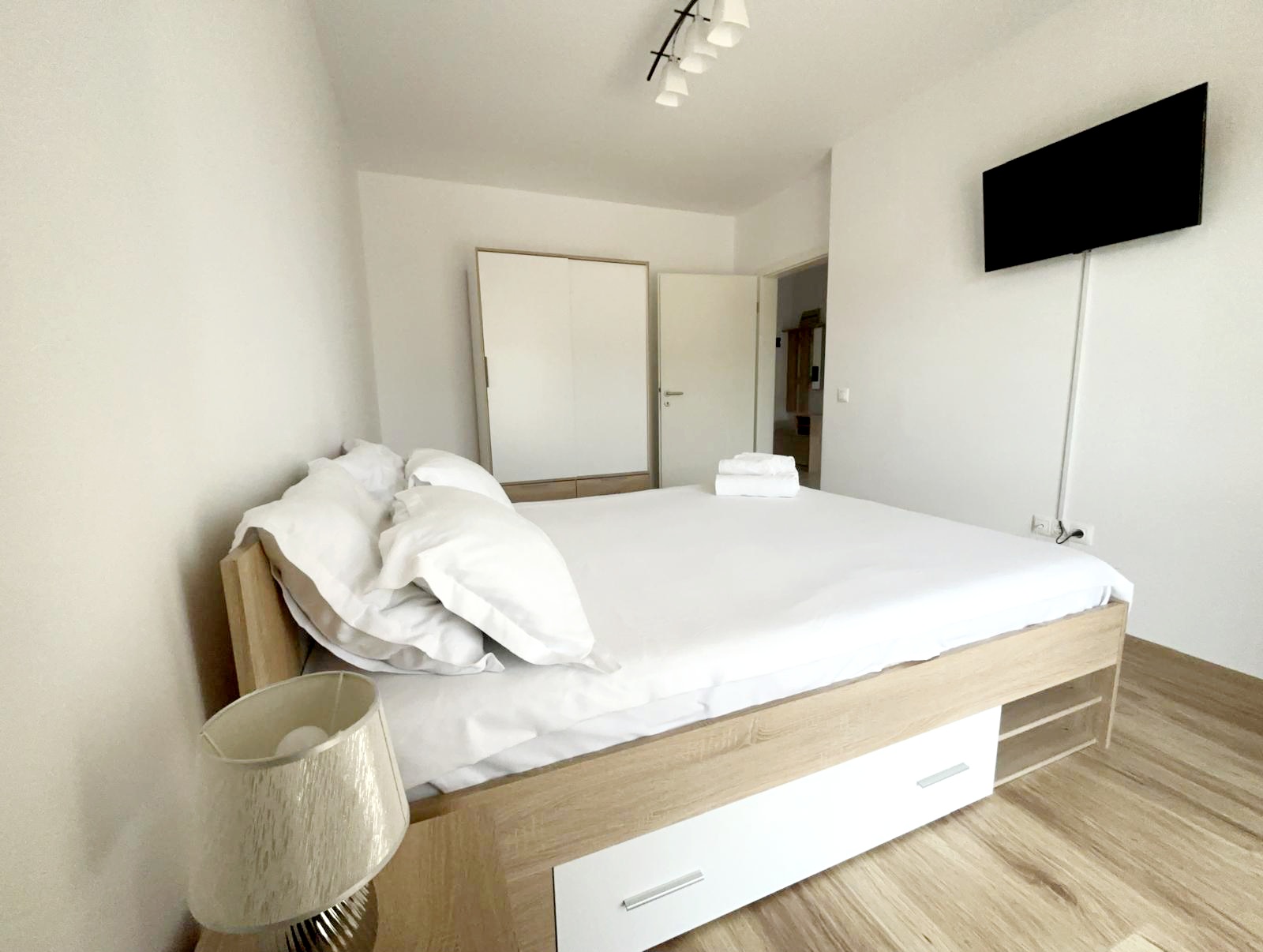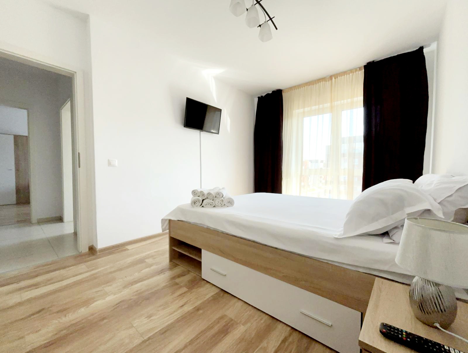 We offer hotel-style apartments, all rated 3 stars by the Ministry of Tourism, located in Braov, in a modern residential area, Avantgarden Bartolomeu, just 4 km from the historic center, with quick and strategic access to all areas of tourist interest in Braov and its surroundings, such as Bran Castle, Rânov Fortress and Dino Park, and the Water Paradise. They offer all the comforts for a pleasant and relaxing stay. They have a bedroom with a double bed, a fully equipped modern kitchen, a spacious living room with a double sofa bed, a furnished terrace with mountain views, and private parking. The apartments are located in a residential complex with playgrounds, generous green spaces, relaxation areas for moments of tranquility, restaurants, and various shops. The bus stop is a 2-minute walk away, providing easy access to the historic center (8 minutes away), the train station (15 minutes away), the airport (9 minutes away), and Poiana Braov. The accommodation units are easily accessible, ideal for families with children and wheelchair users; a small ramp provides access to the lobby, from where you can reach the accessible elevator that serves all floors, from which you can access the apartment entrances. Located just 2-4 minutes apart, our apartments are perfect for a vacation in Braov, even for groups or delegations. Discover the magic of Braov with a stay with us!