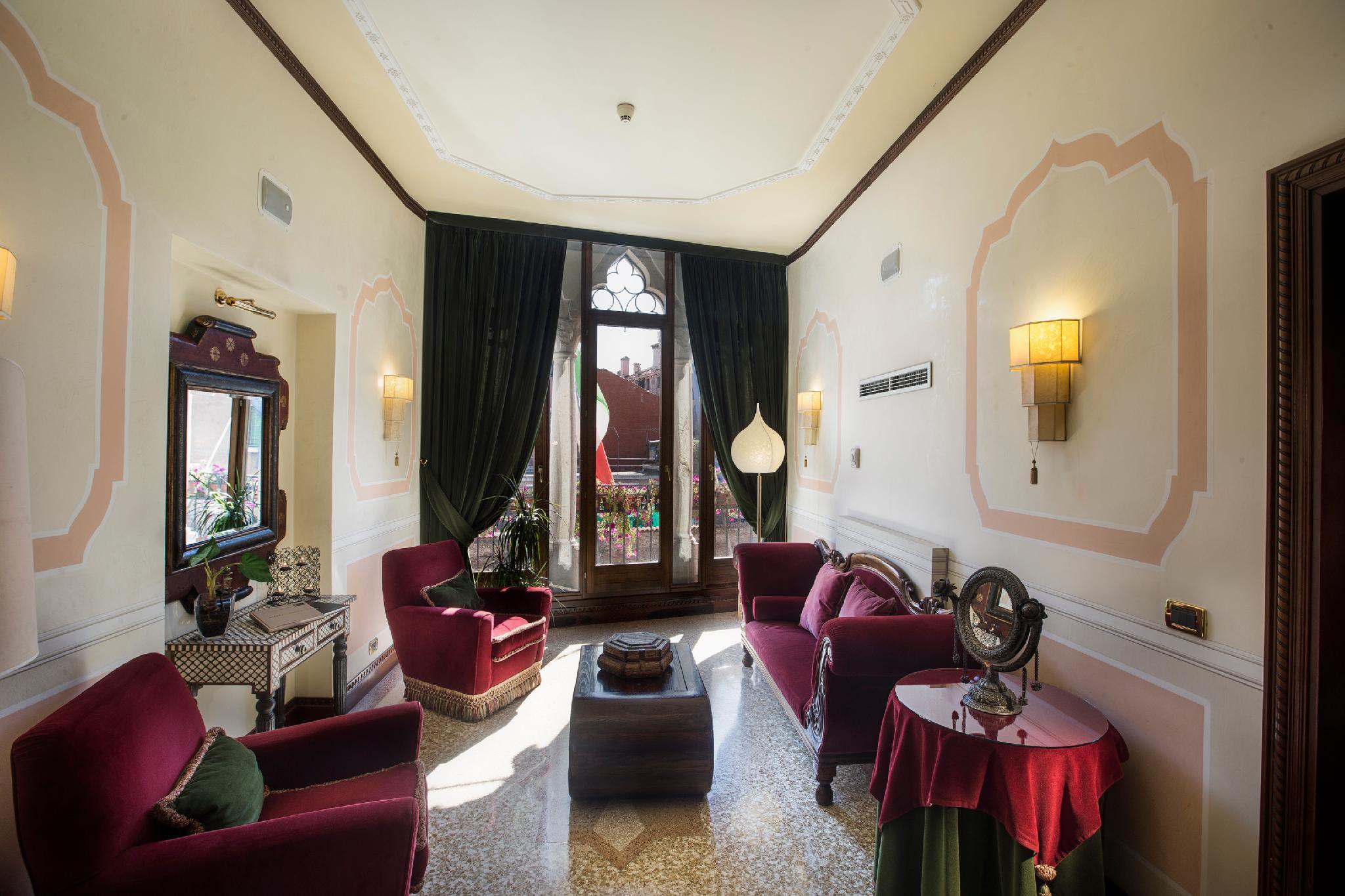 Located in the Cannaregio district of Venice, the Ai Mori d'Oriente Hotel is a refurbished 15th-century Venetian palace, situated near the Madonna dell'Orto and the historic Jewish Ghetto. It is within walking distance of the Madonna dell'Orto water bus station, offering connections to Piazzale Roma and Venezia Santa Lucia Train Station. The hotel offers air-conditioned rooms with Moorish-style furniture, LCD TVs with satellite channels, and private bathrooms with designer toiletries and bidets. Some rooms overlook the canal. Amenities include complimentary Wi-Fi, a bar/lounge, a snack bar/deli, and a terrace and garden. The hotel provides concierge services, a 24-hour business center, express check-in/check-out, and luggage storage. Airport transfer, taxi, and car hire services are available. A buffet breakfast is served daily.